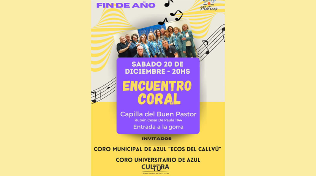 ENCUENTRO CORAL "Fin de Año" | Capilla del Buen Pastor, Capilla del Buen Pastor Anterior Siguiente Categorías de Evento: Concierto InfoGalería de ImágenesENCUENTRO CORAL «Fin de Año» Participan: *Coro Matices de Azul *Coro Municipal de Azul «Ecos del Callvú» *Coro Universitario de Azul Sábado 20 de Diciembre, 20 hs. Capilla del Buen Pastor Rubén César De Paula 1144, AZUL, Bs. As. Entrada a la gorra. -----------------EmailWhatsAppFacebook 19