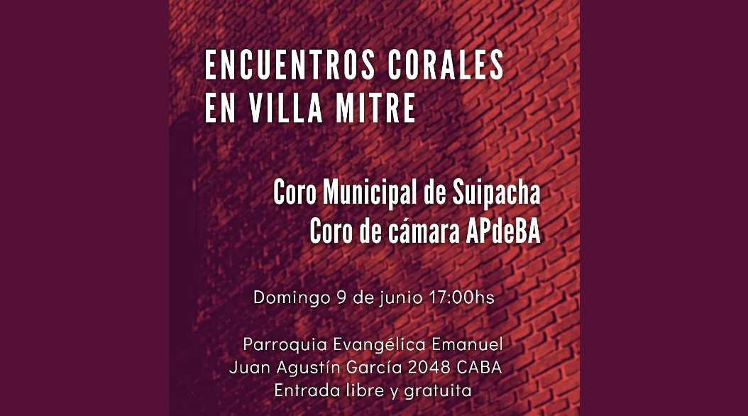 Encuentro Corales en Villa Mitre | Parroquia Evangélica Emanuel, CABA Anterior Siguiente Categorías de Evento: Encuentro Coral InfoGalería de ImágenesEncuentro Corales en Villa Mitre *Coro Municipal de Suipacha *Coro de Cámara APdeBA Dir. Mauro Ferreira Domingo 9 de Junio, 17 hs. Parroquia Evangélica Emanuel, Juan Agustín García 2048, CABA Entrada libre y gratuita. -----------------EmailWhatsAppFacebook 12