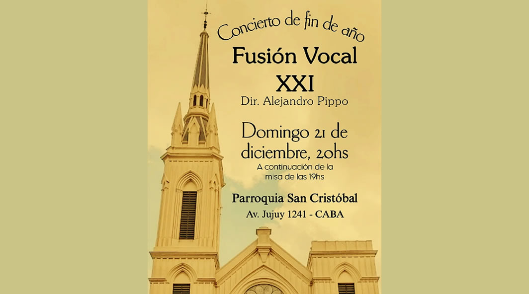 FUSIÓN VOCAL XXI "Concierto de Fin de Año" | Parroquia San Cristóbal, CABA Anterior Siguiente Categorías de Evento: Concierto InfoGalería de Imágenes«Concierto de Fin de Año» *FUSIÓN VOCAL XXI Dir. Alejandro Pippo Domingo 21 de Diciembre, 19 hs. Parroquia San Cristóbal, Av. Jujuy 1241, CABA -----------------EmailWhatsAppFacebook 29