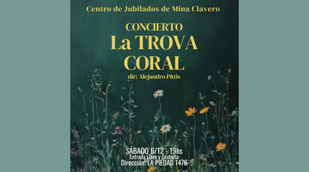 LA TROVA CORAL | Centro de Jubilados de Mina Clavero, MINA CLAVERO, Córdoba Anterior Siguiente Categorías de Evento: Concierto InfoGalería de Imágenes*LA TROVA CORAL Dir. Alejandro Pittis Sábado 6 de Diciembre, 19 hs. Centro de Jubilados de Mina Clavero La Piedad 1476, MINA CLAVERO, Córdoba -----------------EmailWhatsAppFacebook 21