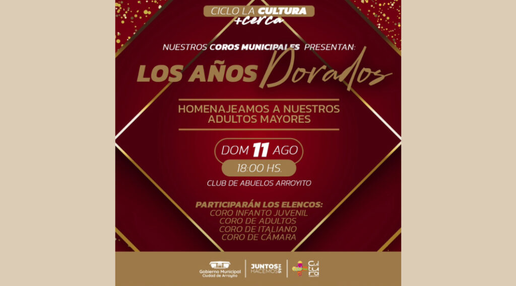 LOS AÑOS DORADOS "Homenaje a Nuestros Adultos Mayores" | Club de Abuelos, ARROYITO, Córdoba Anterior Siguiente Categorías de Evento: Encuentro Coral InfoGalería de ImágenesLOS AÑOS DORADOS «Homenaje a Nuestros Adultos Mayores» Participan nuestros Coros Municipales: *Coro Infanto Juvenil *Coro de Adultos *Coro de Italiano *Coro de Cámara Domingo 11 de Agosto, 18 hs. Club de Abuelos, Cristobal Colón 1070, ARROYITO, Córdoba -----------------EmailWhatsAppFacebook 31