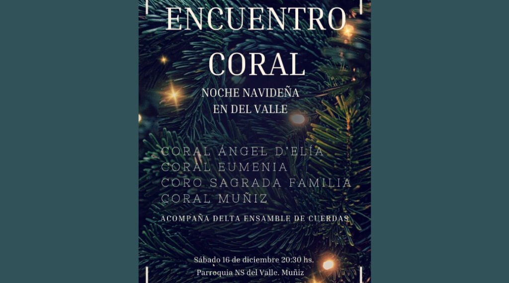 NOCHE NAVIDEÑA EN DEL VALLE | Pquia. Ntra. Sra. del Valle, MUÑIZ, Bs. As. Anterior Siguiente Categorías de Evento: Encuentro Coral InfoGalería de ImágenesEncuentro Coral NOCHE NAVIDEÑA EN DEL VALLE Participan: *Coral Ángel D’Elía *Coral Eumenia *Coro Sagrada Familia *Coral Muñiz Acompaña: Delta Ensamble de Cuerdas Sábado 16 de Diciembre, 20.30 hs. Pquia. Ntra. Sra. del Valle, Azcuénaga 1649, MUÑIZ, Bs. As. -----------------EmailWhatsAppFacebook 19