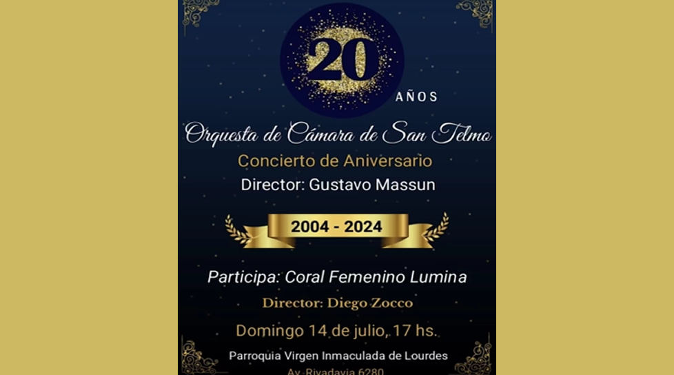 Orquesta de Cámara San Telmo "20 Años" & Coro Femenino Lumina | Pquia. Virgen Inmaculada de Lourdes, CABA Anterior Siguiente Categorías de Evento: Concierto InfoGalería de ImágenesConcierto Aniversario «20 Años» 2004-2024 *Orquesta de Cámara San Telmo Dir. Gustavo Massun Participa: *Coral Femenino Lumina Dir. Diego Zocco Domingo 14 de Julio, 17 hs. Pquia. Virgen Inmaculada de Lourdes, Av. Rivadavia 6260, CABA -----------------EmailWhatsAppFacebook 33