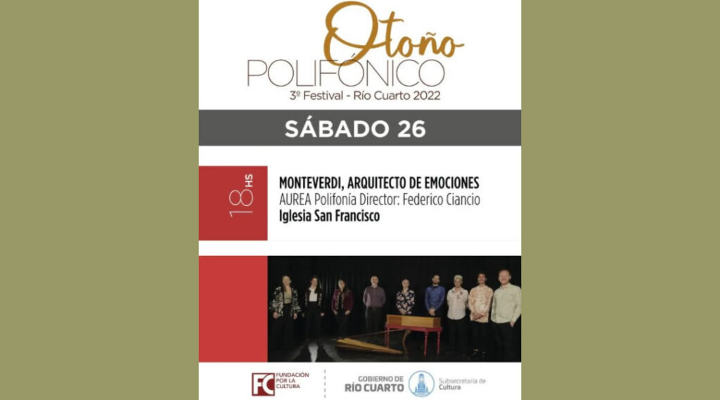 Otoño Polifónico | 3er. Festival, RÍO CUARTO, Córdoba Anterior Siguiente Categorías de Evento: Festival Coral InfoGalería de ImágenesOtoño Polifónico 3er. Festival, RÍO CUARTO 2022 Monteverdi, Arquitecto de emociones. AUREA Polifonía Dir. Federico Ciancio Sábado 26 de Marzo, 18 hs. Iglesia San Francisco Alvear y Deán Funes, RÍO CUARTO, Córdoba -----------------EmailWhatsAppFacebook 24