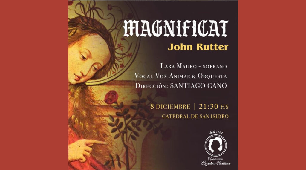 Vocal Vox Animae & Orquesta "MAGNIFICAT de John Rutter" | Catedral de San Isidro, SAN ISIDRO, Bs. As. Anterior Siguiente Categorías de Evento: Concierto InfoGalería de Imágenes«MAGNIFICAT de John Rutter» *Vocal Vox Animae & Orquesta Dir. Santiago Cano Lara Mauro, Soprano. Viernes 8 de Diciembre, 21.30 hs. Catedral de San Isidro, Av. del Libertador 16200, SAN ISIDRO, Bs. As. -----------------EmailWhatsAppFacebook 41